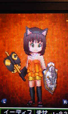 主人公にはフェンサードレスがお気に入りで青系でかっこかわいく統一しているんだけど、どう見ても軍配な風林火山は全然似合わない(スキル100まで上げているのでどの職でも装備可)。
